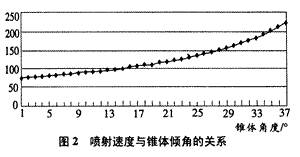 (6)各風(fēng)道頭部錐體的角度是噴煤管設(shè)計(jì)的關(guān)鍵,在一次風(fēng)一定的情況下,參數(shù)的大小直接影響燃燒器的動(dòng)量范圍,與噴射速度有直接關(guān)系。圖2顯示了2500t/d級(jí)回轉(zhuǎn)窯窯頭燃燒器軸流風(fēng)速與錐度的關(guān)系。